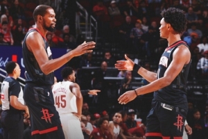賽后火箭官方曬出本場贏球海報(bào),杜蘭特和阿門擊掌瞬間登上封面。