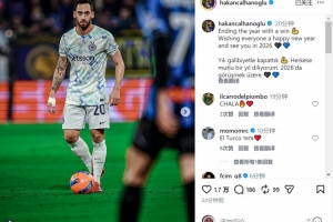 國(guó)米中場(chǎng)恰爾汗奧盧社媒曬出比賽照片,并寫道:“以一場(chǎng)勝利結(jié)束這一年,祝大家新年快樂,2026年見?!?/p>
