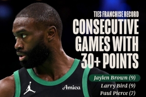 凱爾特人官方曬出統(tǒng)計(jì),杰倫·布朗連續(xù)9場(chǎng)比賽砍下30+,追平拉里·伯德保持的隊(duì)史紀(jì)錄!