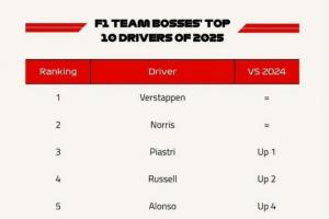 體育資訊12月29日訊 F1官方公布了本賽季的年度車隊(duì)領(lǐng)隊(duì)評(píng)分,其中,維斯塔潘排名第一,諾里斯第二,皮亞斯特里第三。
