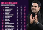 而據(jù)OPTA統(tǒng)計(jì),在英超2025全年積分榜上,阿森納39場83分高居第一,曼城少賽兩場積80分排第二,維拉、利物浦、切爾西少賽一場分列三至五名。