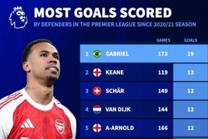 體育資訊12月31日訊 《轉(zhuǎn)會市場》統(tǒng)計了20-21賽季以來的英超后衛(wèi)進球情況,槍手中衛(wèi)加布里埃爾獨自領(lǐng)跑。