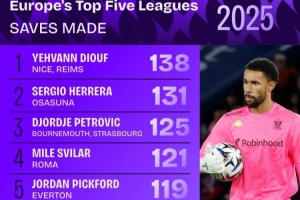體育資訊1月1日訊 Squawka列2025年五大聯(lián)賽門將撲救次數(shù)榜,尼斯門將葉赫萬·迪烏夫以138次居首。