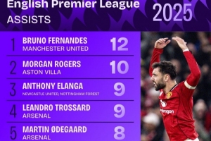 體育資訊1月1日訊 Squawka統(tǒng)計2025年英超球員助攻次數(shù)榜,B費(fèi)12次居首,摩根·羅杰斯10次第二。