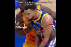 GIF-庫里被連拉帶拽 跑到底角還被一屁股拱倒 裁判沒有任何表示