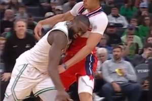 發(fā)際線粉事件之一:對(duì)陣奇才時(shí)杰倫·布朗發(fā)際線粉粘到對(duì)手白T上