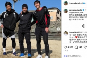 體育資訊1月2日訊 日本國腳鐮田大地更新社媒,曬出自己在元旦和兩名老將香川真司、長友佑都一同在海邊訓練的照片。