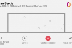 據(jù)Opta統(tǒng)計(jì),霍安·加西亞本場(chǎng)比賽做出6次撲救,2023年11月特爾施特根對(duì)陣皇家社會(huì)之后,他是首位西甲單場(chǎng)6次撲救+零封的巴薩門將。