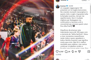 布雷默達(dá)成尤文生涯出戰(zhàn)100場(chǎng)里程碑,他在社交媒體上寫(xiě)道:“能夠身披黑白戰(zhàn)袍出戰(zhàn)100場(chǎng)比賽,我深感自豪。我正在這家俱樂(lè)部經(jīng)歷美妙的時(shí)光,我要感謝整個(gè)尤文大家庭,這對(duì)我意義非凡。”