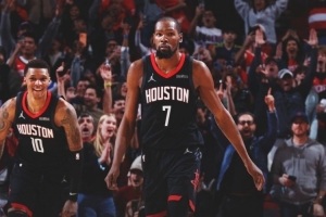 賽后火箭曬出贏球海報(bào),杜蘭特占據(jù)C位,小賈巴里·史密斯同框。