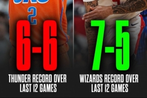 截止目前,雷霆30勝7負,排名西部第1;奇才10勝25負,排名東部第14。
