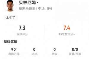 體育資訊1月9日訊 皇馬在本輪西超杯對(duì)陣馬競(jìng),貝林厄姆本場(chǎng)數(shù)據(jù)如下: