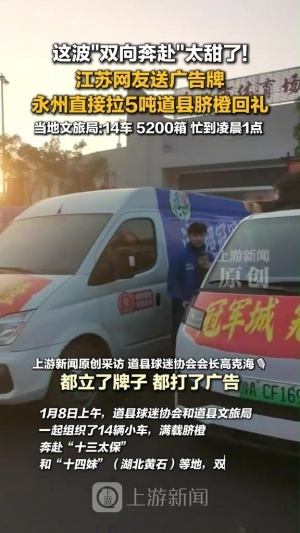 體育資訊01月09日訊 湖南永州隊(duì)奪得2025年湘超冠軍,據(jù)《上游新聞》報(bào)道,江蘇網(wǎng)友送冠軍永州隊(duì)廣告牌,永州直接拉5噸道縣臍橙回禮