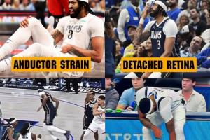 濃眉自被湖人交易至獨行俠后至今僅為獨行俠出戰(zhàn)了29場比賽,在這29場比賽內(nèi),他已遭遇了6處不同的傷病,分別是(按時間順序):內(nèi)收肌拉傷、視網(wǎng)膜脫離、小腿挫傷、跟腱酸痛、腹股溝拉傷、左手韌帶損傷。