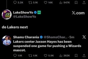 Shams也是有求必應(yīng),在五分鐘后報(bào)道了湖人中鋒海斯被禁賽一場(chǎng)的消息??。