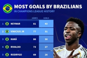 體育資訊2月18日訊 德國轉(zhuǎn)會市場統(tǒng)計了巴西球員在歐冠的進(jìn)球數(shù)量,并列出歐冠歷史巴西球員射手榜,內(nèi)馬爾43球居首,維尼修斯31球次席。
