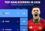 曼聯(lián)的謝什科每90分鐘進(jìn)1.65球高居榜首;切爾西的佩德羅以0.86球排名第二;阿森納的哲凱賴什和切爾西的帕爾默以0.79球并列第三。