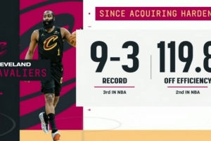 備注:哈登出戰(zhàn)的比賽 騎士8勝1負(fù)
