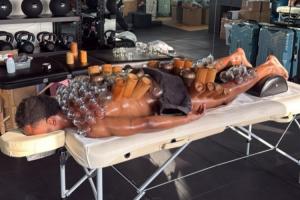 照片中的奧蓬達正在進行拔罐,他從頸部到小腿全部安上了各種材質的罐子。意大利媒體介紹稱,拔罐是一種可以緩解疼痛和放松肌肉的皮膚療法。