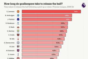 英超各隊(duì)門(mén)將平均拿球/撲救后球出手時(shí)間:
