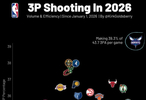 橫軸-三分總出手?jǐn)?shù);縱軸-三分命中率;黃蜂場均出手43.7次&命中率為39.3%