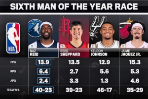 納茲·里德 球隊(duì)?wèi)?zhàn)績40勝23負(fù) 場均13.9分6.4籃板2.4助攻
