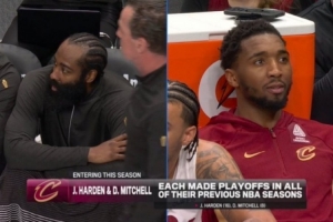 騎士VS獨(dú)行俠,轉(zhuǎn)播方曬出紀(jì)錄:哈登和米切爾生涯每個(gè)賽季都打進(jìn)了季后賽。