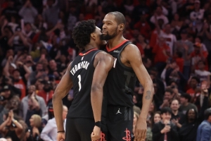 本場比賽杜蘭特出戰(zhàn)40分鐘,投籃24中13,三分球7中3,罰球4中3,砍下32分6籃板5助攻1搶斷1蓋帽;阿門也出戰(zhàn)40分鐘15投7中(三分3中2)、罰球8中7,砍下23分12籃板(6個前板)8助攻1搶斷。