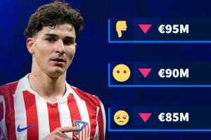 德轉給出了阿爾瓦雷斯身價變動的4個可能選項:9500萬歐元、9000萬歐元、8500萬歐元、8000萬歐元,目前阿爾瓦雷斯的身價為1億歐元,這也意味著他的身價一定會迎來下跌。