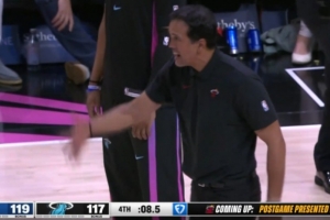 這球怎么看?熱火落后4分拉松發(fā)球被吹5秒違例 斯波場邊直接氣炸