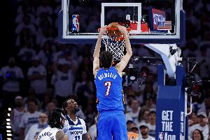雷霆內(nèi)線霍姆格倫上半場(chǎng)表現(xiàn)活躍,不僅有突破單手劈扣的精彩表現(xiàn),籃板拼搶和防守上也充分發(fā)揮他的身高優(yōu)勢(shì)和靈活性。