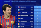 據(jù)德轉(zhuǎn)(Transfermarkt)的統(tǒng)計,在連續(xù)賽季歐冠進(jìn)球這一指標(biāo)上,梅西和本澤馬并列歷史第一。