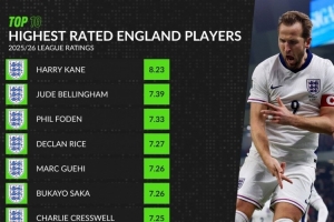 體育資訊12月5日訊 WhoScored統(tǒng)計了本賽季英格蘭球員的聯(lián)賽場均評分,并列出榜單,凱恩居首,貝林厄姆、福登分列二三位。