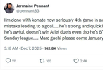 彭南特在社交媒體上這樣寫道:“我真的受夠科納特了,連續(xù)第四場比賽因為他的失誤導致丟球??萍{特身體強壯、速度也快,但也就這樣了——他在技術層面慘不忍睹,身高 6英尺4英寸(約1.93 米)卻贏不了高空球,傳球水平堪比業(yè)余聯(lián)賽球員?!?/p>