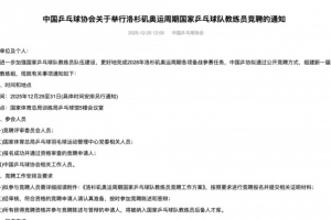 體育資訊12月20日訊 新華社報(bào)道,中國(guó)乒乓球協(xié)會(huì)官網(wǎng)于20日發(fā)布《中國(guó)乒乓球協(xié)會(huì)關(guān)于舉行洛杉磯奧運(yùn)周期國(guó)家乒乓球隊(duì)教練員競(jìng)聘的通知》,正式啟動(dòng)新周期國(guó)家隊(duì)教練員公開競(jìng)聘工作。