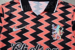 另一個突出的細(xì)節(jié)在于廣告贊助商區(qū)域,傳統(tǒng)的贊助商標(biāo)志被替換為手寫體風(fēng)格、“切爾西”字樣的單詞,經(jīng)典的流暢筆觸進(jìn)一步強(qiáng)化了球衣的復(fù)古身份。