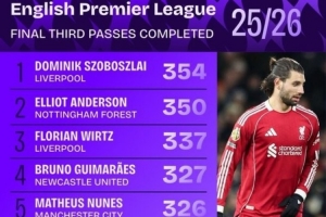 本賽季英超進(jìn)攻三區(qū)成功傳球榜: